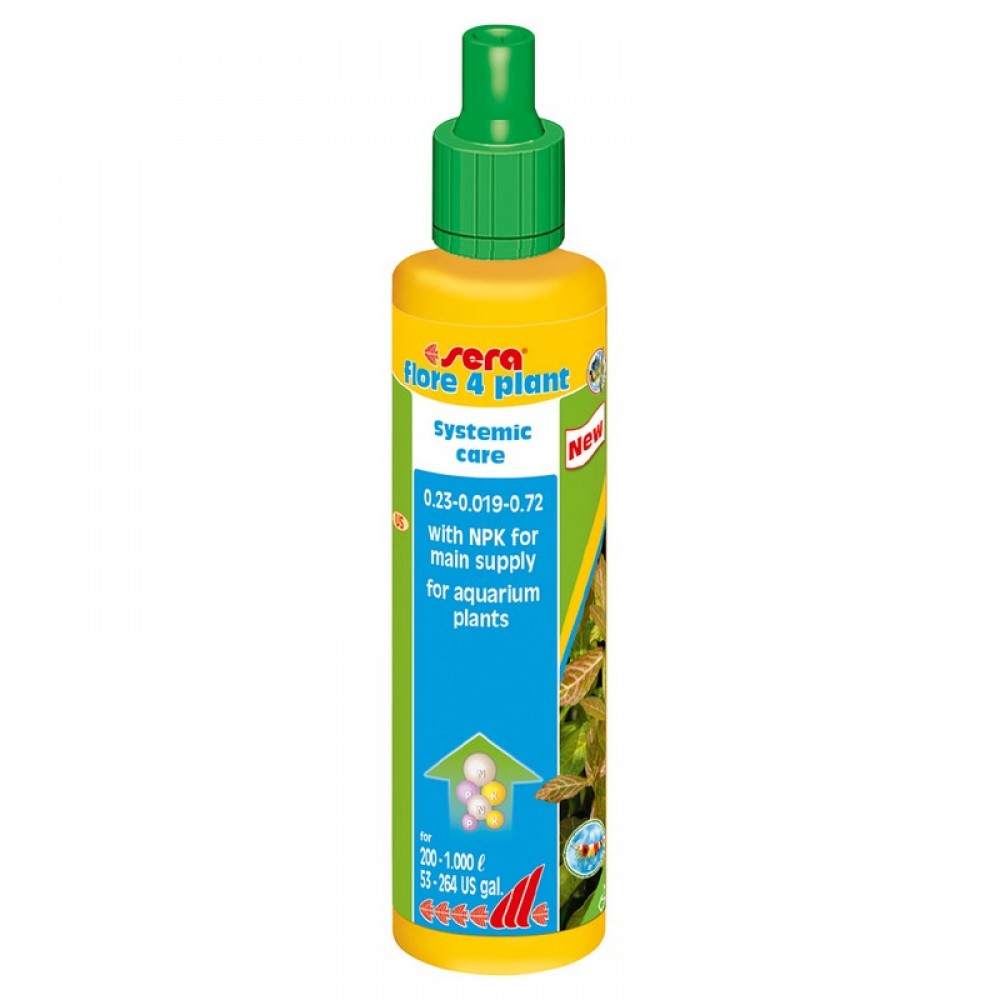 Το sera flore 4 plant δημιουργήθηκε για την χορήγηση των υδρόβιων φυτών σε φυτεμένα (aquascapes) και Ολλανδικού τύπου ενυδρεία, αζώτου, φωσφόρου και καλίου σε ιδανικές αναλογίες – για υγιή και δυναμική ανάπτυξη. Το sera flore 4 plant είναι καλά ανεκτό από τα ασπόνδυλα.